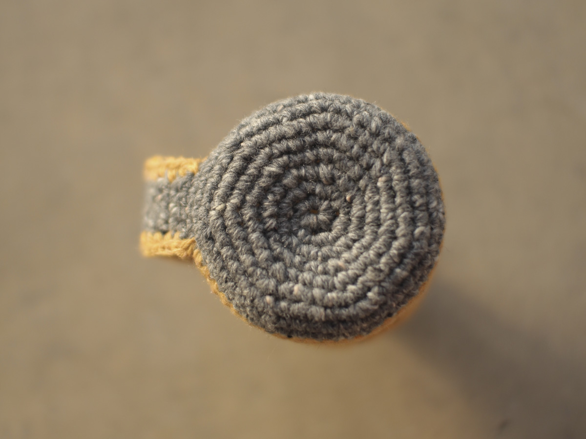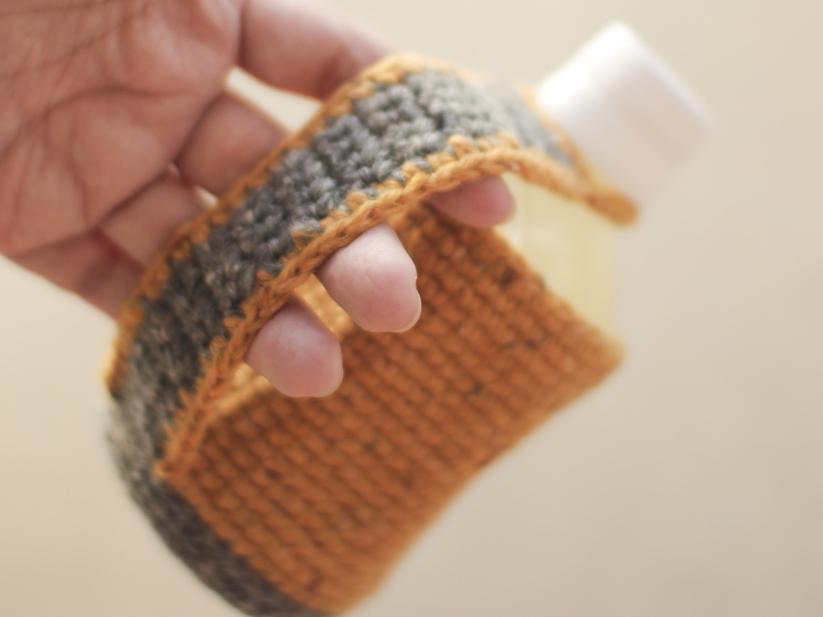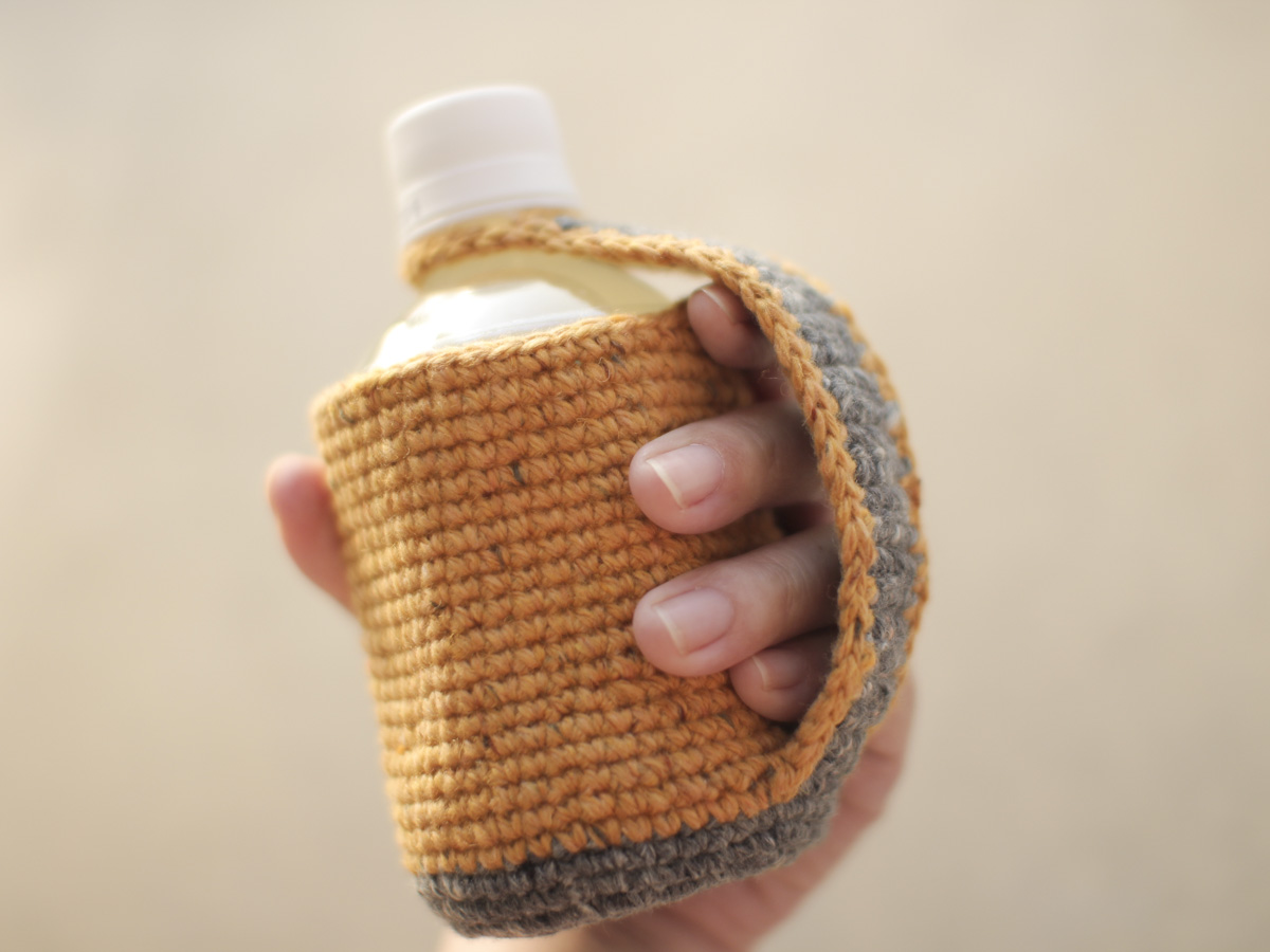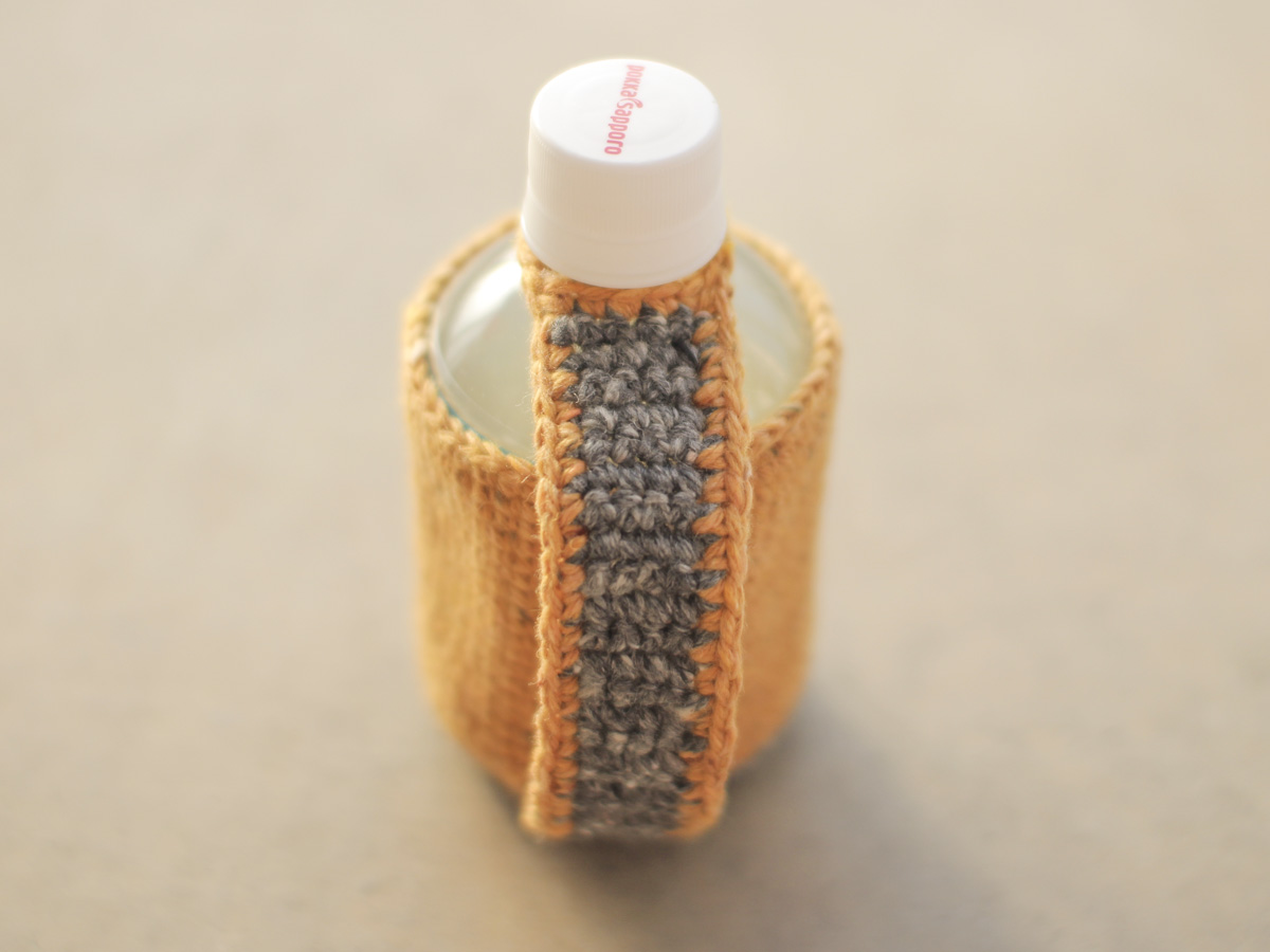 手編みで製作した280ml前後の小さなペットボトル用のホルダーです。